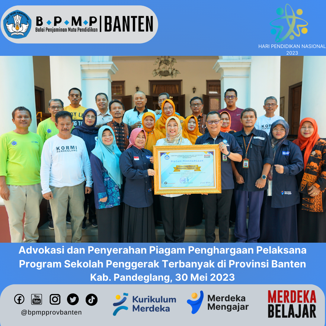 Pada hari selasa 30 Mei 2023 bertempat di Pendopo Kab. Pandeglang. BPMP Provinsi Banten melaksanakan advokasi dan penyerahan piagam penghargaan pelaksana program Sekolah Penggerak terbanyak kepada Pemerintah Daerah Kab. Pandeglang.