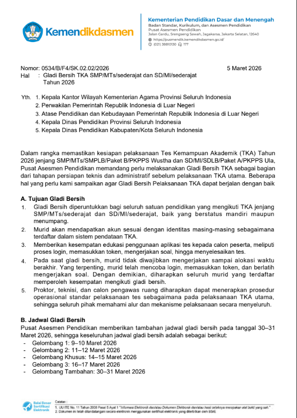 Dalam rangka memastikan kesiapan pelaksanaan Tes Kemampuan Akademik (TKA) Tahun 2026, Pusat Asesmen Pendidikan, Badan Standar, Kurikulum, dan Asesmen Pendidikan Kemendikdasmen akan melaksanakan Gladi Bersih TKA bagi satuan pendidikan jenjang SD/MI/sederajat dan SMP/MTs/sederajat di seluruh Indonesia. Kegiatan ini menjadi bagian penting dalam tahapan persiapan sebelum pelaksanaan TKA utama.