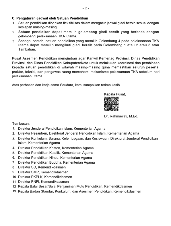 Melalui pelaksanaan gladi bersih ini, diharapkan seluruh satuan pendidikan dapat lebih siap dalam menyelenggarakan Tes Kemampuan Akademik Tahun 2026 secara tertib, lancar, dan sesuai dengan prosedur yang telah ditetapkan.