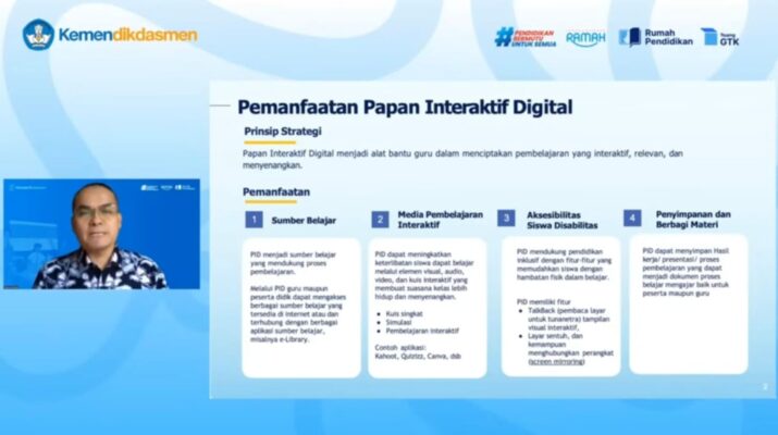Jakarta, 14 Februari 2026 — Kementerian Pendidikan Dasar dan Menengah (Kemendikdasmen), berkomitmen memastikan pemanfaatan Interactive Flat Panel (IFP)/Papan Digital Interaktif (PID) terserap secara maksimal. Melalui Pusat Data dan Teknologi Informasi (Pusdatin), Kemendikdasmen menyelenggarakan Webinar Rilis Pelatihan Mandiri Topik “Pemanfaatan Papan Interaktif Digital dalam Pembelajaran.”