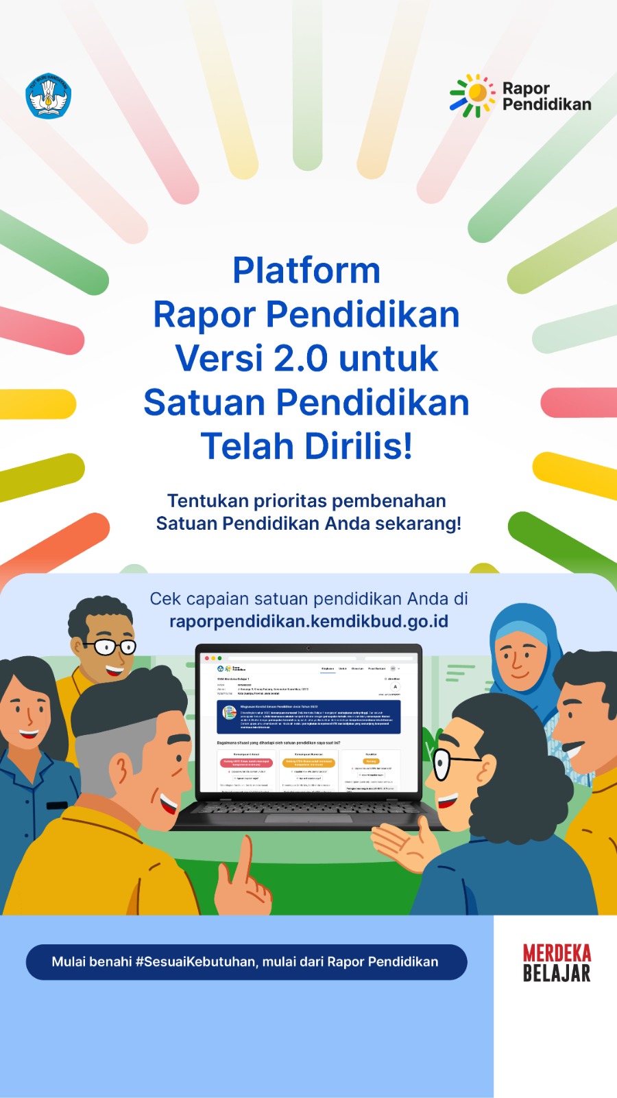 Kepala satuan pendidikan, pendidik, dan operator satuan pendidikan kini dapat mengakses platform Rapor Pendidikan Versi 2.0 melalui laman https://raporpendidikan.kemdikbud.go.id/. Melalui berbagai pembaruan platformnya, satuan pendidikan dapat semakin memahami hasil capaiannya.