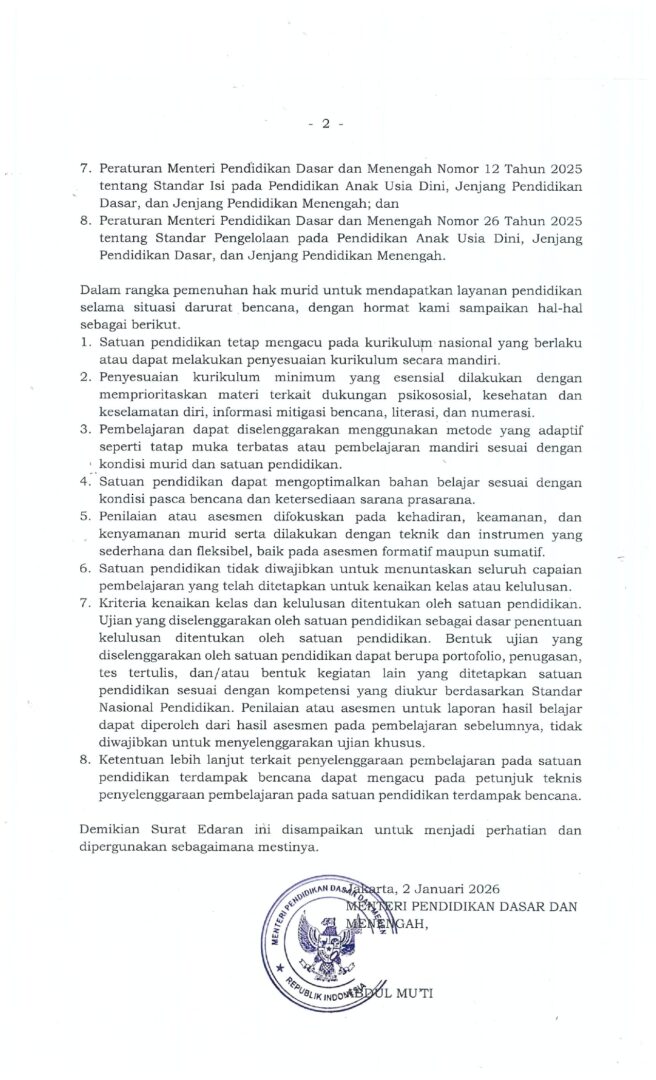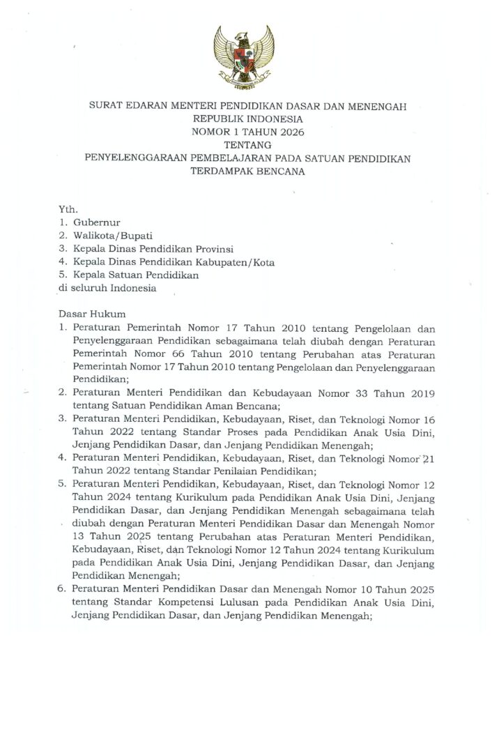 SE Mendikdasmen No.1 Tahun 2026 Tentang Penyelenggaraan Pembelajaran pada Satuan Terdampak Bencana