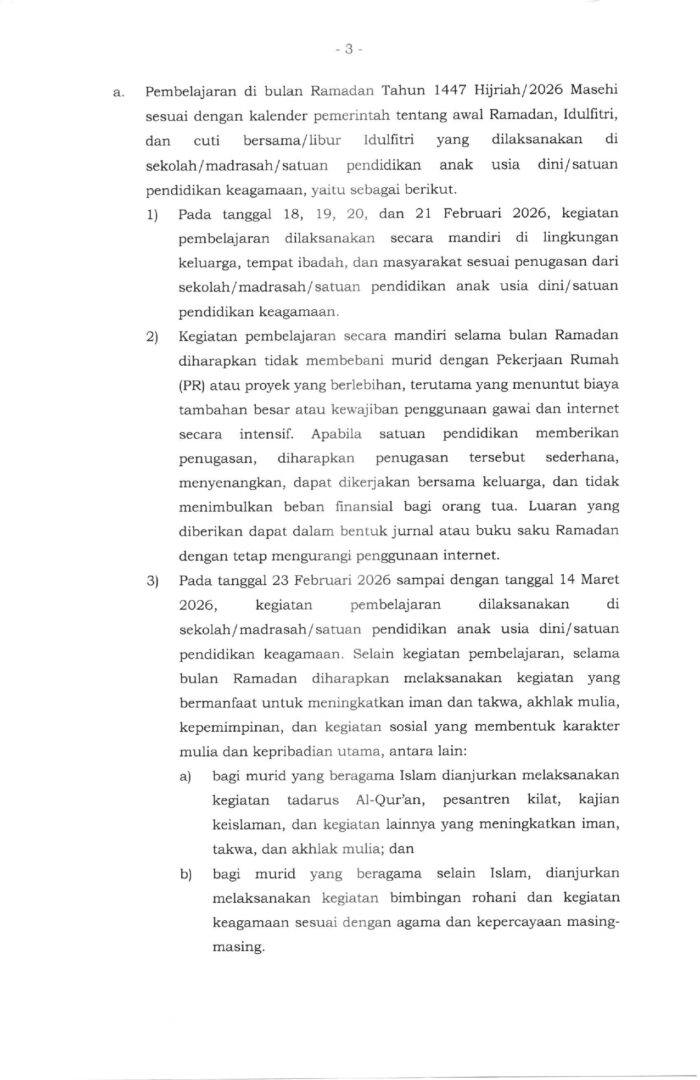 Surat Edaran 3 Menteri Tentang Pembelajaran di Bulan Ramadan Tahun 1447 Hijriah/2026 Masehi