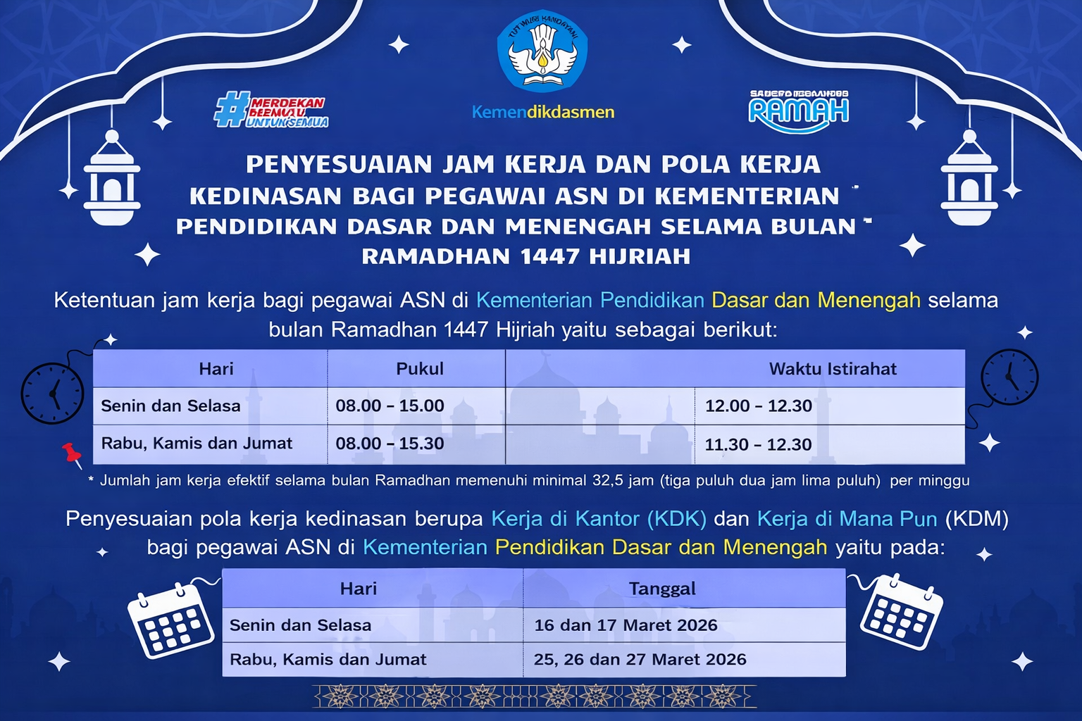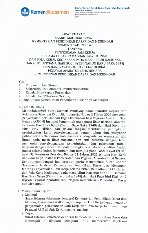 Bersama ini kami sampaikan Surat Edaran terkait Penyesuaian Jam Kerja selama Bulan Ramadan dan Pola Kerja KDM sebelum dan sesudah Idul Fitri 1447H.