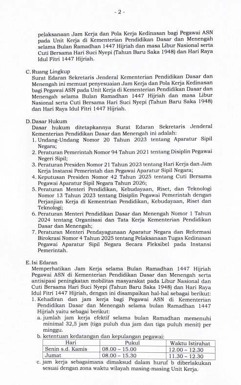 Surat Edaran terkait Penyesuaian Jam Kerja selama Bulan Ramadan dan Pola Kerja KDM sebelum dan sesudah Idul Fitri 1447H.